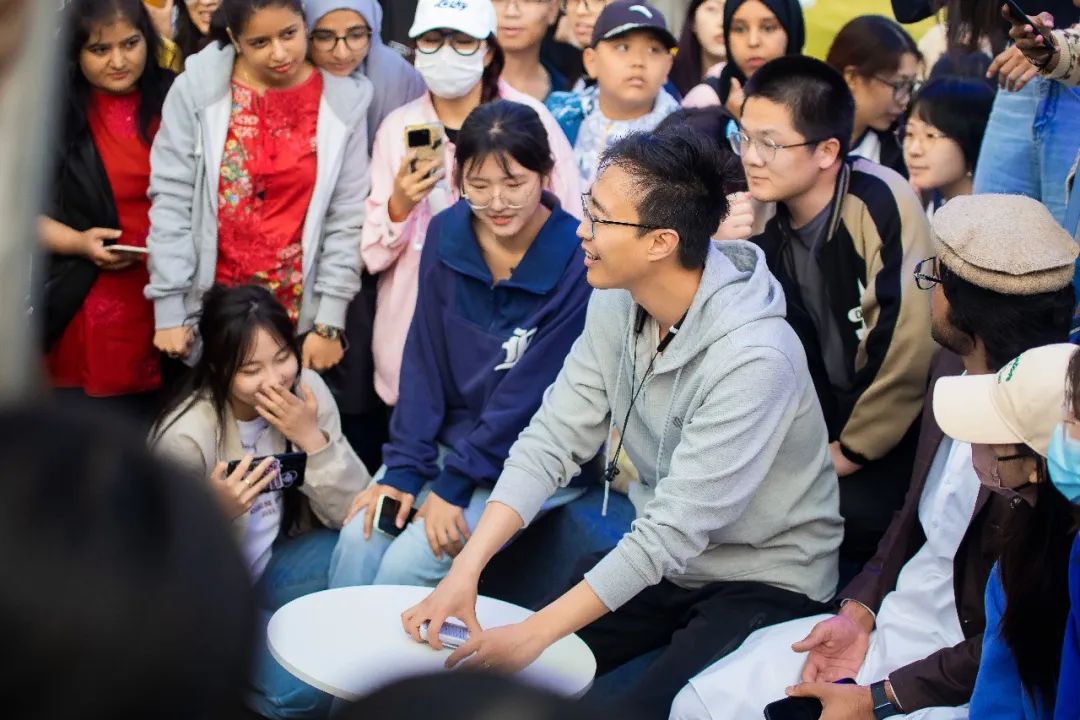 歌舞表演间歇,向日葵视频 院王一儒老师现场表演了一段纸牌魔术。王老师以娴熟的技巧、魔幻的表演点燃了在场观众的热情,现场人头攒动,把王老师团团围住将现场气氛推向了一个小高潮。