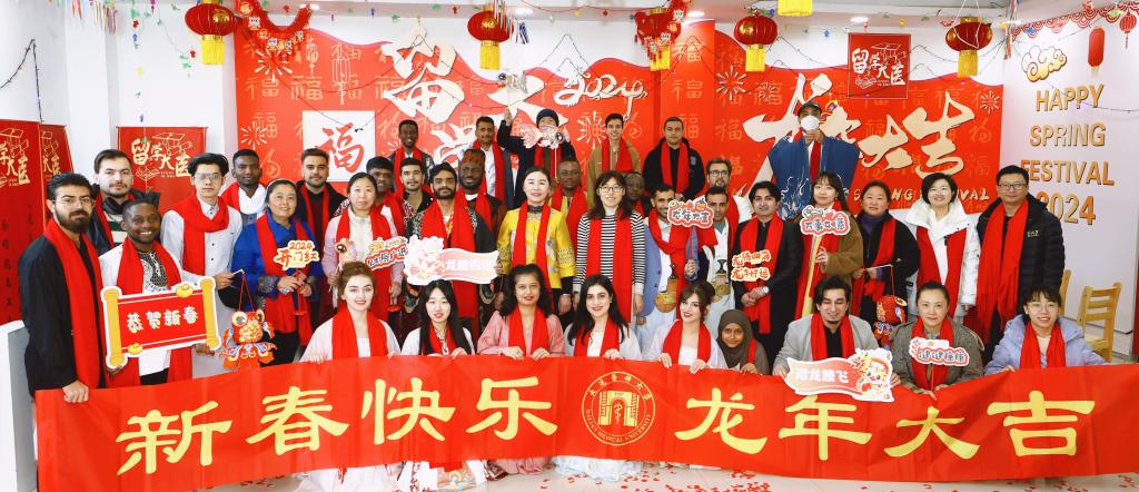 院院长卢苇、直属党支部副书记郭艳秋、学院教师一起,同来自伊朗、斯里兰卡、巴基斯坦等国家的60余名留学生共同欢度新春佳节。