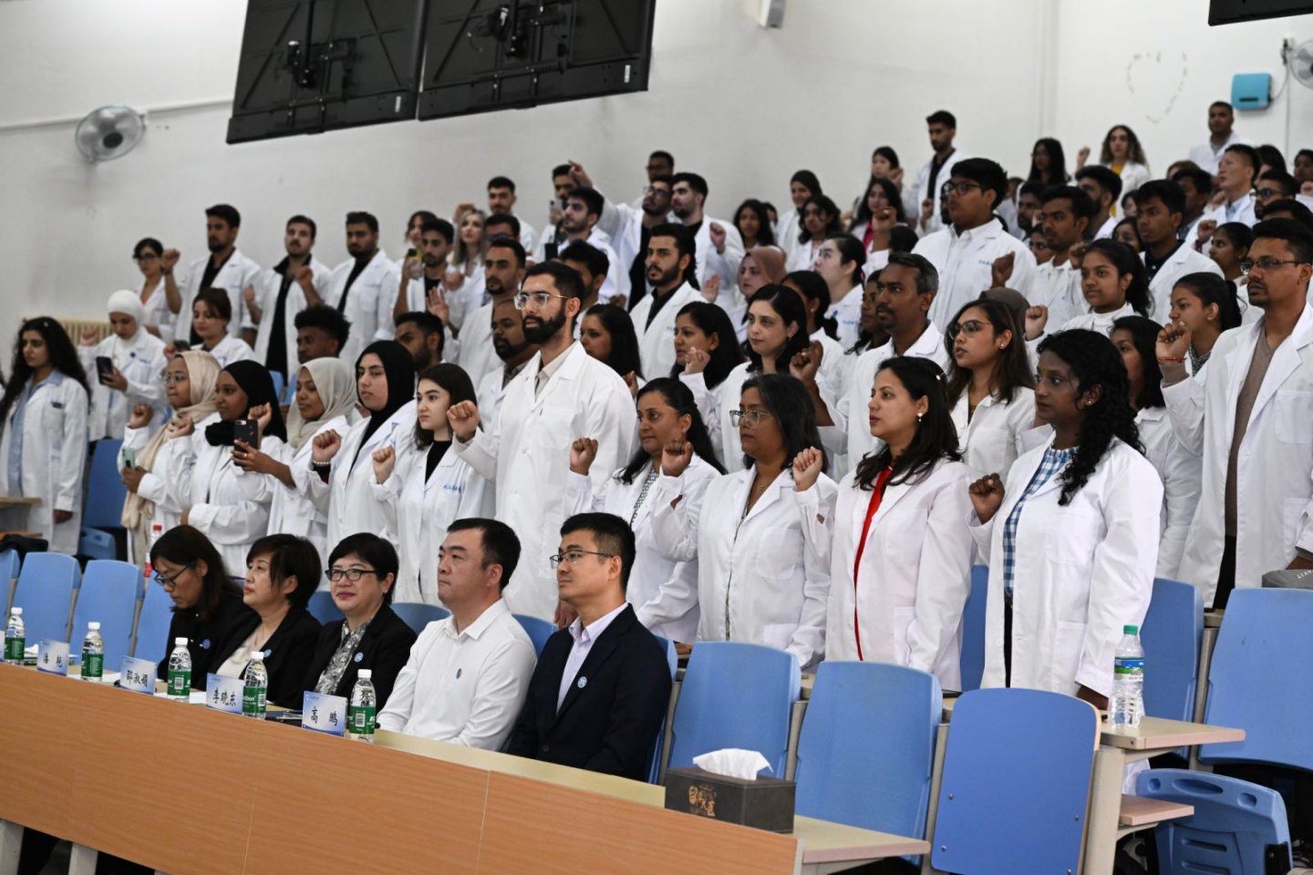 在庄重的仪式环节,潘艳为新生代表佩戴校徽。这枚小小的校徽,是身份的象征,更是责任与使命的寄托。紧接着,全体新生进行了庄严的医学誓词宣誓,铿锵的誓言回荡在会场,彰显了他们投身医学事业、恪守职业操守的坚定信念。