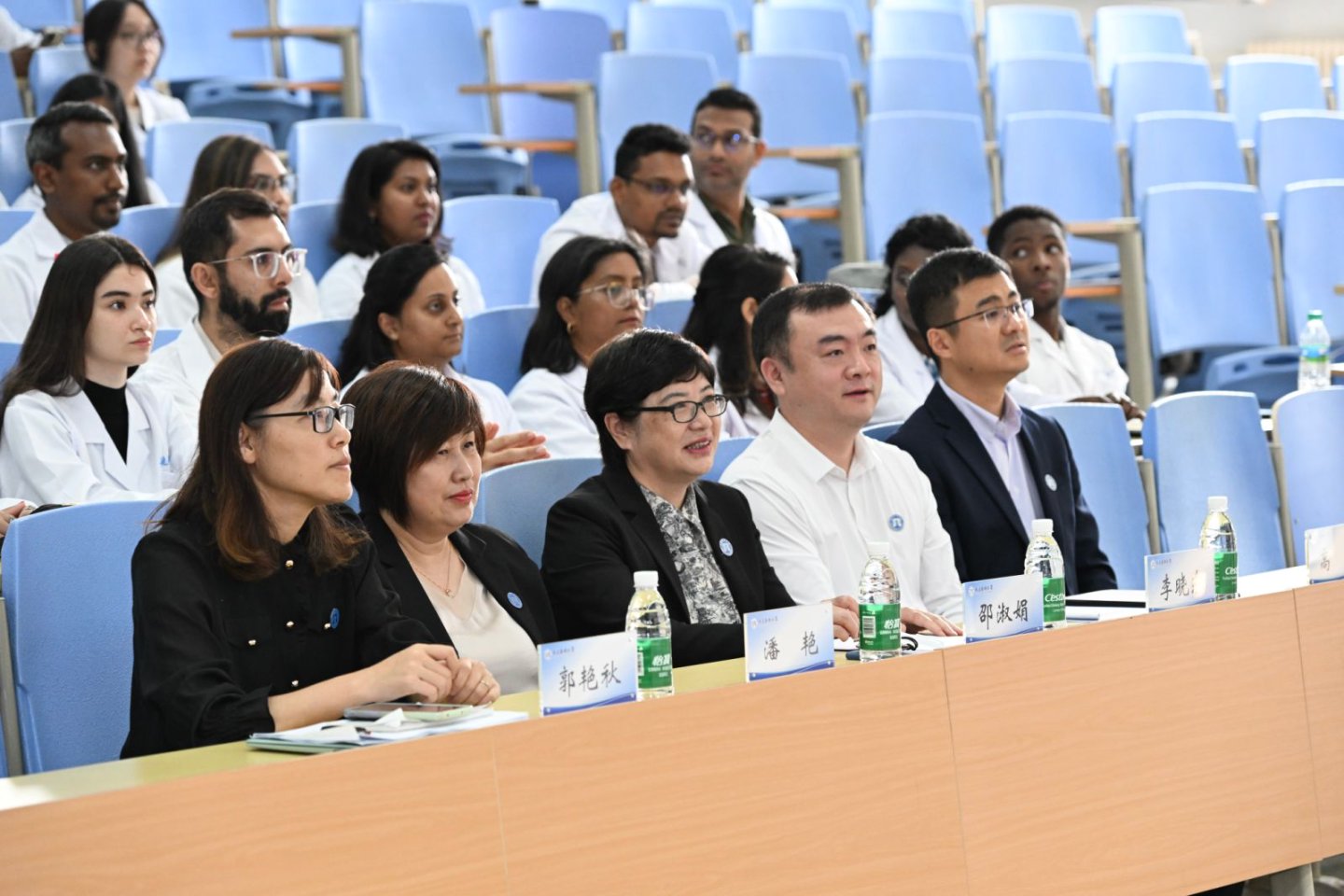 随后,在校留学生代表、2022级临床医学专业本科生普尔同学分享了自己在校学习与生活的宝贵经验,为学弟学妹们提供了有益的借鉴。新生代表、2025级外科学博士那米同学在发言中表达了对于学业的憧憬与决心,并代表全体新生承诺将恪守校规,勤奋求学。