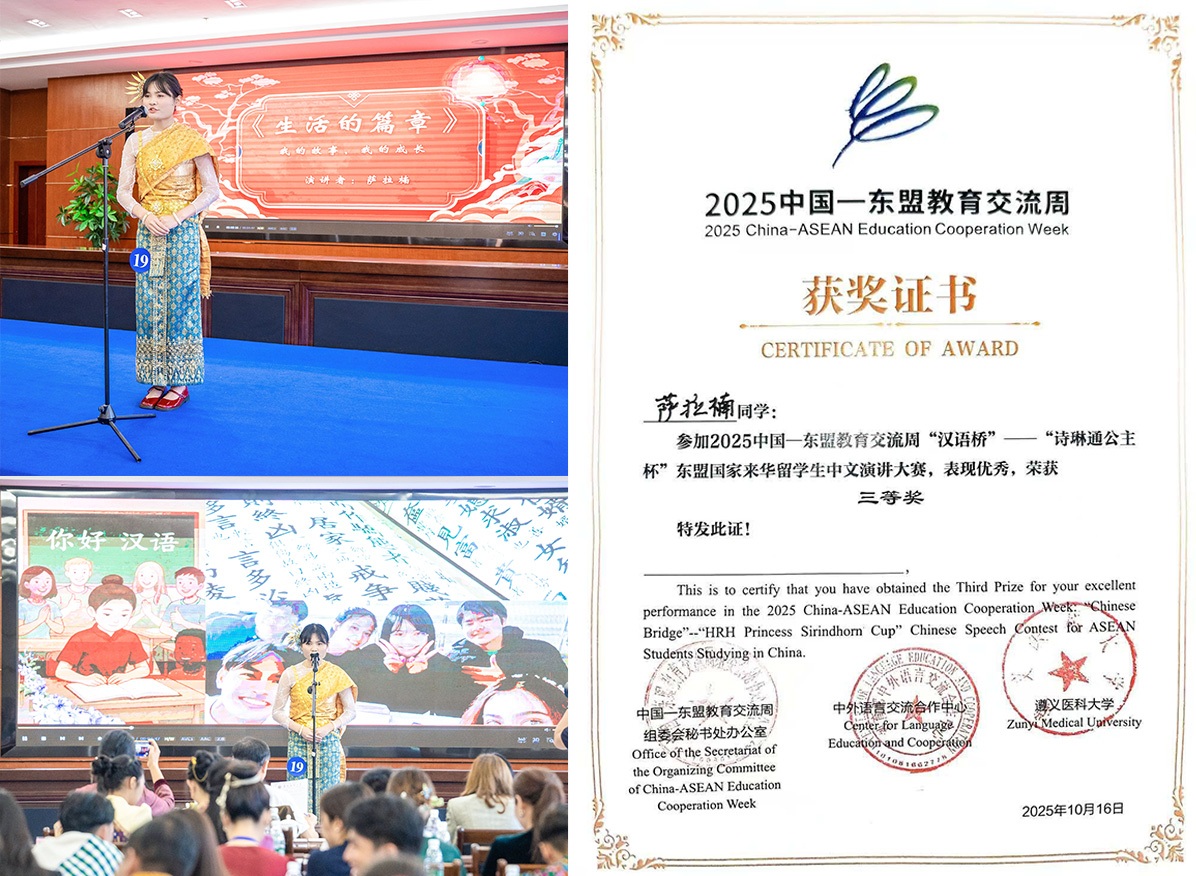 院2024级泰国籍留学生萨拉楠凭借出色表现成功入围交流周“汉语桥”—“诗琳通公主杯”东盟国家来华留学生中文演讲大赛决赛并荣获三等奖,其指导教师闫晓松获颁“优秀指导教师奖”。