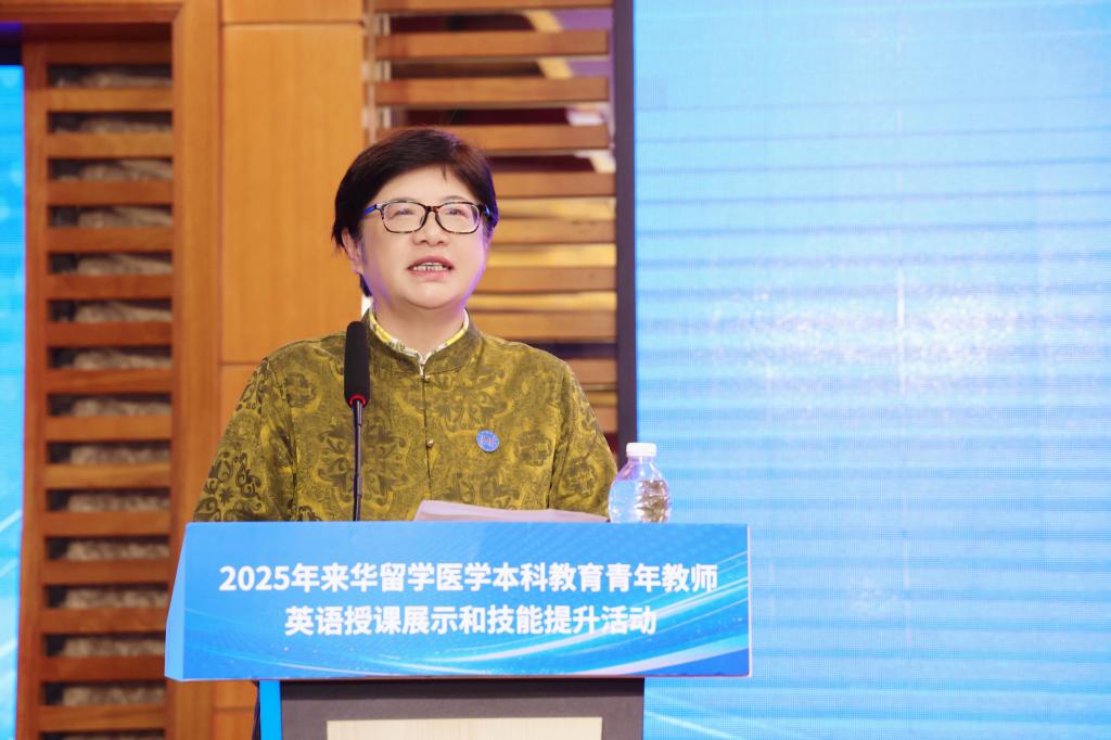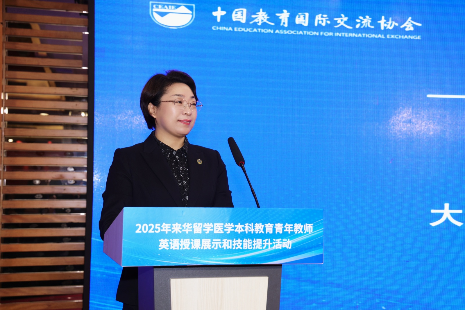 来华留学医学教育工作。她指出,本次活动不仅为医学青年教师提供了展示与交流的平台,也为我国来华留学医学教育的质量提升与教学创新注入了强劲动力,希望各位青年教师在切磋技艺中实现超越、在交流互鉴中启迪智慧、在友谊的交流中收获成长。中国教育国际交流协会副秘书长安延,中国教育国际交流协会国际医学教育分会理事长、山东大学副校长易凡视频致辞,勉励青年教师在交流中取长补短、在实践中锤炼本领,努力提升跨文化教学能力,成长为兼具专业素养和国际视野的优秀医学教育者。