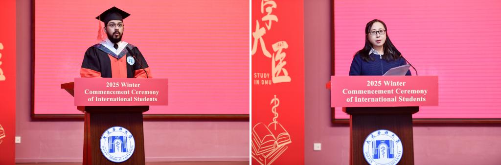 巴基斯坦籍博士研究生瓦利德(YOUSUF WALEED)代表毕业生发言,他回顾了在校学习的经历,表达了对母校培养的感谢,并表示今后将用所学医学知识让世界更美好。
