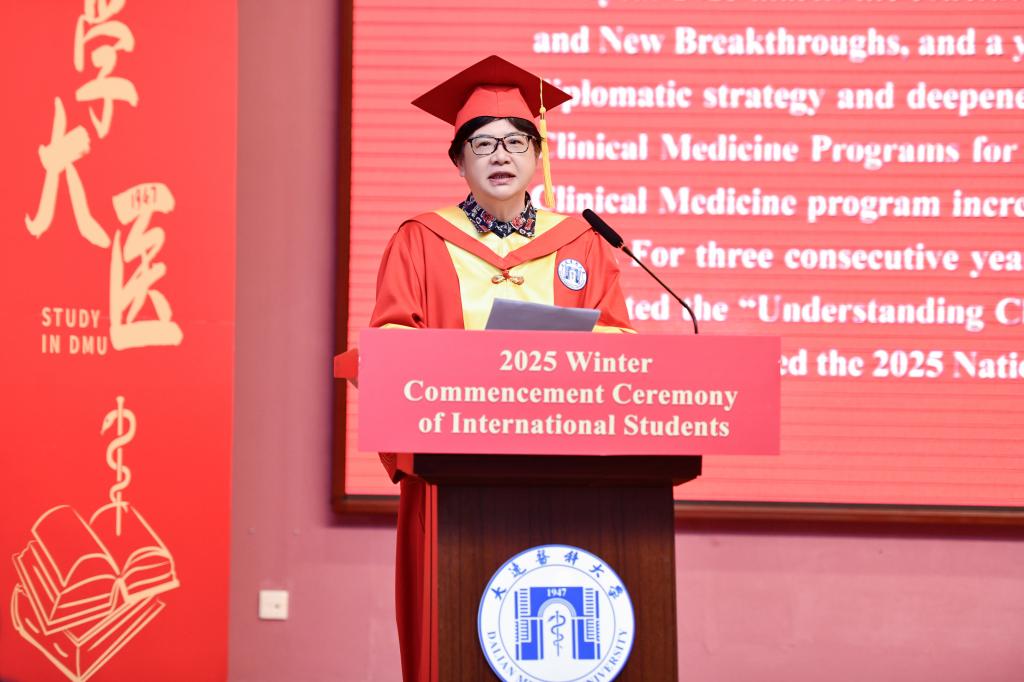 邵淑娟代表学校对顺利完成学业的各位学子表示热烈祝贺,她期望毕业生们以医者仁心为舵,以时代使命为帆,为促进国际医学交流、构建人类卫生健康共同体贡献力量。